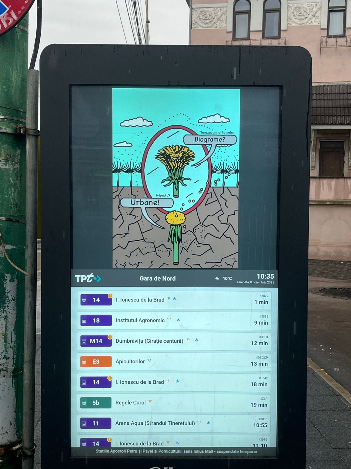 În noiembrie, poate fi întâlnit în toate stațiile de Transport Public Timișoara – TPT, unde călătorii se intersectează, poate fără să știe, cu aceste specii reziliente.